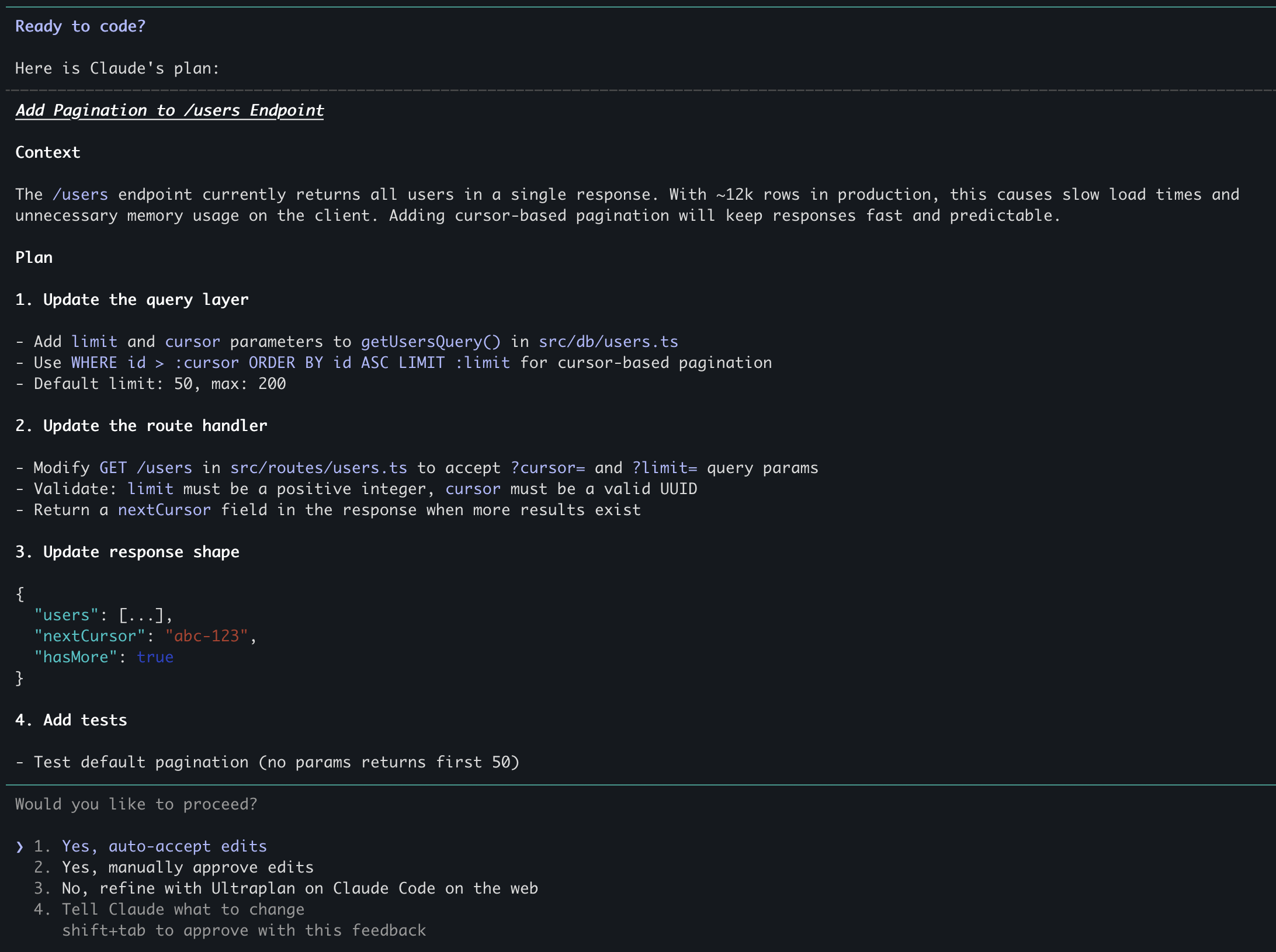 When you see the plan, treat it like a PR: edit it, challenge it. That's the whole point, catching misalignment before the code exists.