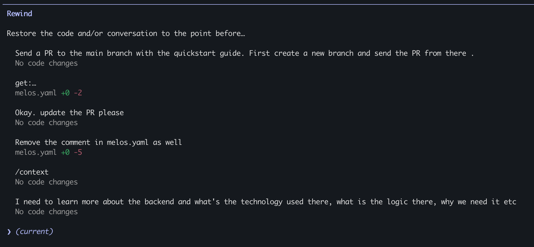 Gotcha: files touched by Bash (rm, mv, cp) aren't tracked. Only direct file edits through CC's Edit/Write tools are reversible.